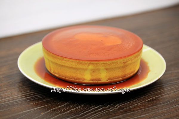 冷却之后,用一个大圆盘,压住模具底部。迅速翻转。慢–慢扣出蛋糕(因为用的是不粘模,所以没有多余的脱模动作,如果用其他的固底模,需要用脱模刀划一圈使得蛋糕脱模)。因为焦糖会吸收布丁里的水分,所以这个蛋糕会有焦糖水流出。是正常现象,这也是她美味的一部分哟。底部的蛋糕浸着一点焦糖液,会别有风味和好吃!!