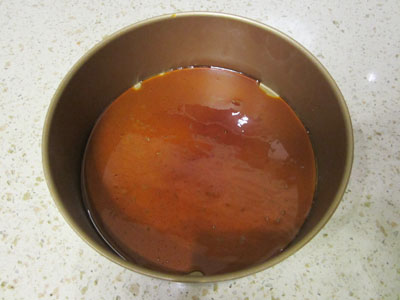 将焦糖液,倒入固定底的模具底部,摇晃下,使之布满均匀。冷却后是比较粘稠的一层,不流动