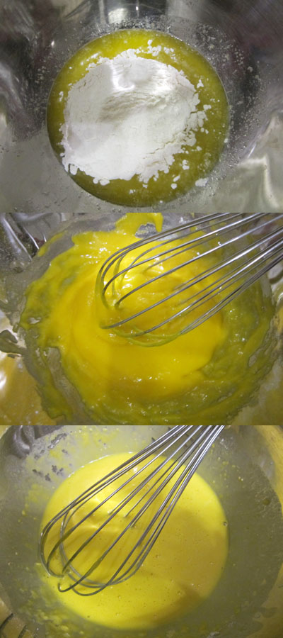 此时温度稍降,再加入打散的蛋黄搅拌,最后加入牛奶搅拌均匀。(注意加入蛋黄时,面糊温度不宜过高免得蛋黄结块)