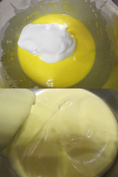 将1/3的蛋白,挖到蛋黄糊里。搅拌均匀后,再倒回蛋白里,轻轻搅拌均匀