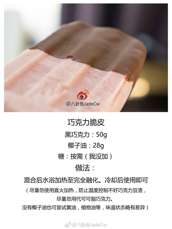 发布于2012年7月17日2019年6月11日 由八卦兔JADECW【巧克力脆皮】 之前做雪糕配方的时候漏写的…..雪糕的【巧克力脆皮】做法。补上~ 这个做出来是薄薄的一层,蘸一下就凝固,咬一口能咔吧脆的脆皮。 【雪糕配方合集】之前漏看的可以点这里:°你的好友雪糕君已经上线 收藏 (7) +1已打分已有 4 用户参与44 : 0 +1已打分