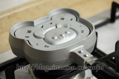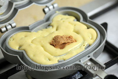 然后挖一大勺面糊倒上模具,(我用的是大汤勺不是小调羹哈)然后在小熊脸上放上你喜欢的馅心