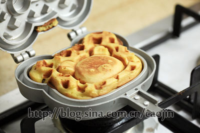 再倒上半勺面糊,使之布满模具的一面。然后看到面糊鼓起来。立刻合拢模具!翻面一次,中小火烘烤2分钟,再翻面烘烤2分钟。全程大概4分钟左右。就差不多可以打开检查烧色了。