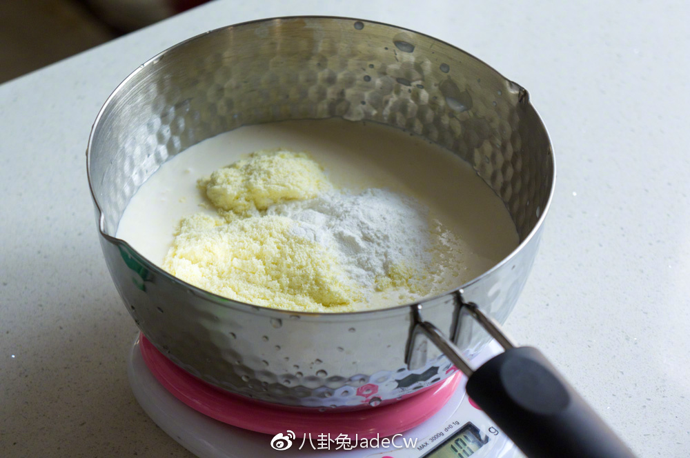 牛奶200g,鲜奶油:150g;奶粉:35g;细砂糖:30g 玉米淀粉:8g