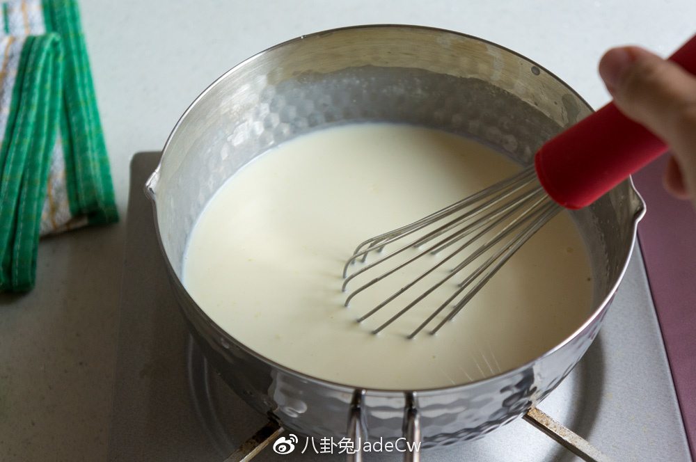 (注意,一定小火慢热,一直要搅拌防止糊底和结疙瘩,推荐尽量过一次筛)