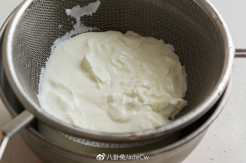 无糖的酸奶,自制或者购买均可。倒入滤网,底下放容器接水。