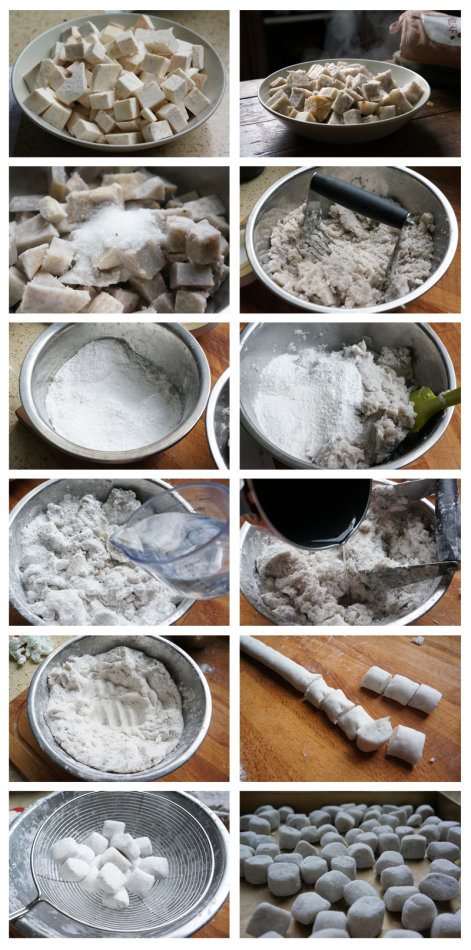材料:芋头:560g 地瓜粉:210g 太白粉:70g 细砂糖:50g