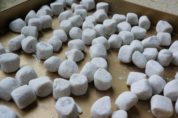 11-12:将切好的芋圆滚马铃薯粉,然后用筛子摇晃,筛掉多余的粉留着给其他芋圆滚…