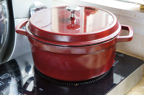 铸铁锅,加盖,锅盖上倒入一杯水。继续保持小火炖1小时,至牛肉熟烂