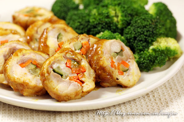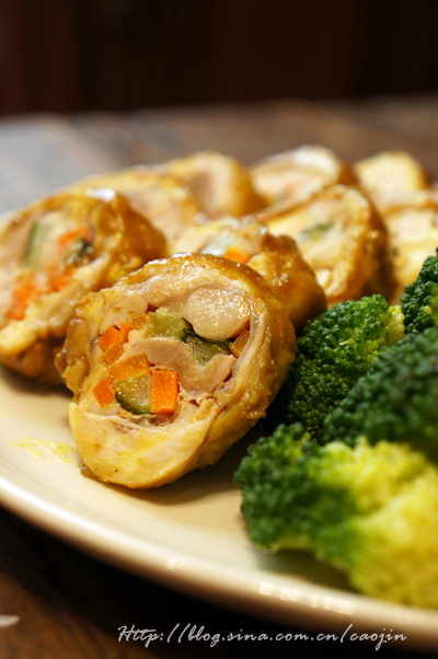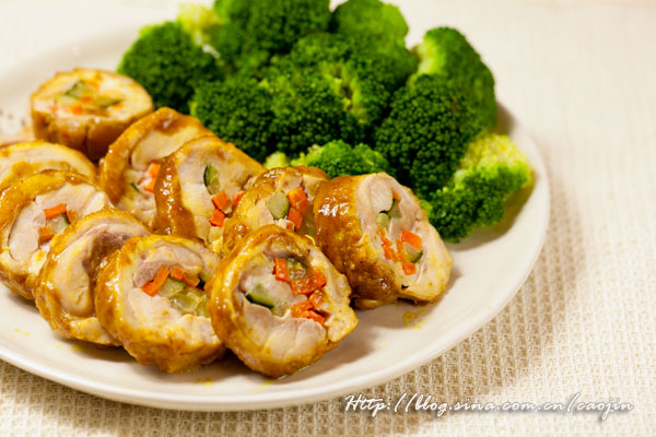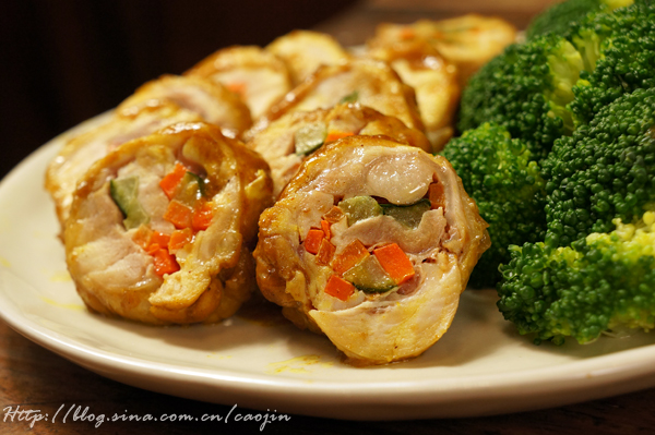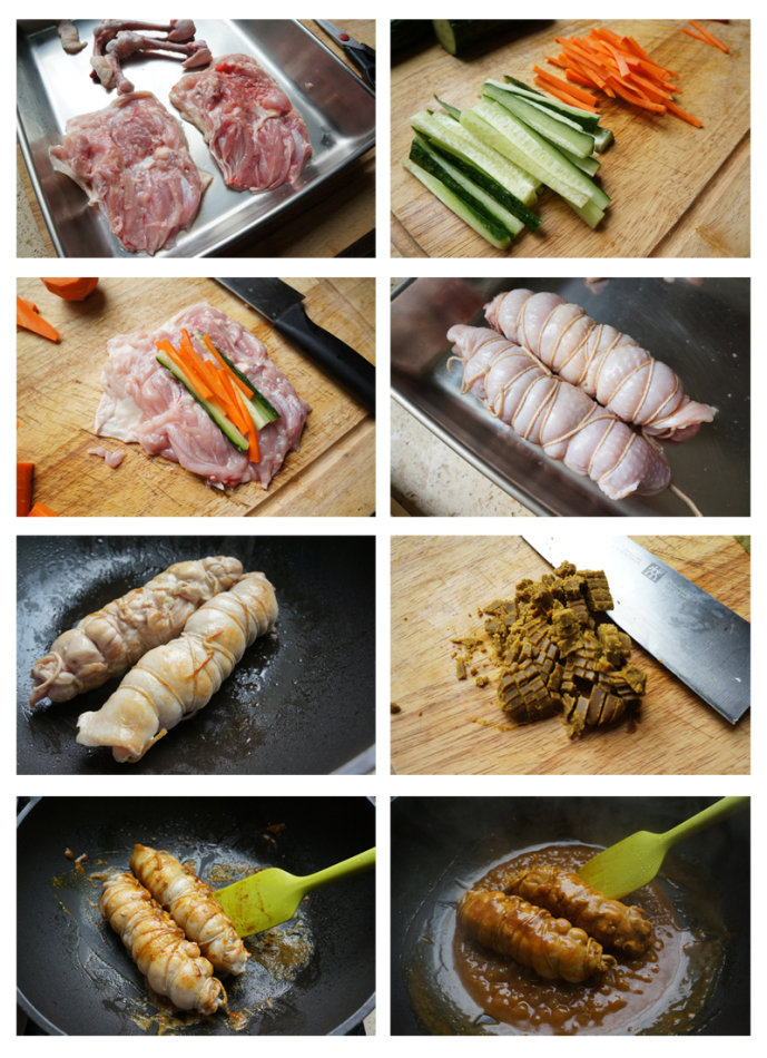 这道菜没有什么特别的难度,因为是用现成的咖喱块,很方便,最主要的就是鸡肉包入蔬菜的时候要耐心细心的一点点包,并用棉绳固定。
