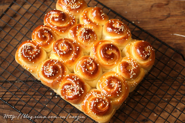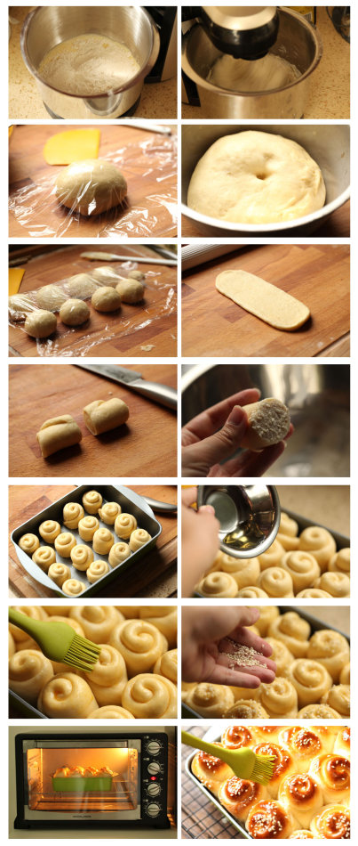 6-9,擀开后卷起,用刀从中间切断。底部蘸水,再蘸底料,均匀的排入烤盘内.盖上保鲜膜或者湿布,放于温暖湿润的地方最后发酵至2倍大,约30-40分钟。