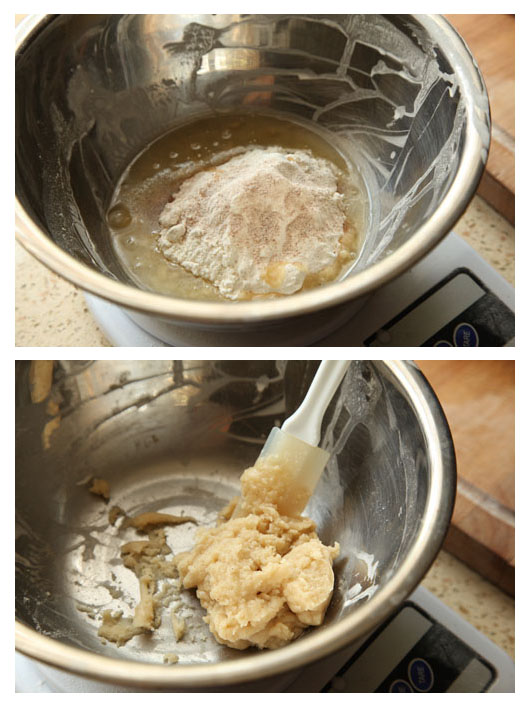 1,将天然酵种与水混合均匀,再加入面粉和其他材料。