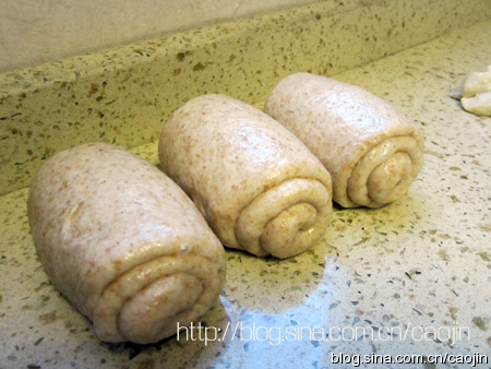 松弛后,用排气棒擀开。从侧面卷起(如果面团回弹比较多,不容易擀开则松弛不够),卷成小卷。不必卷太紧。排好,继续松弛约10分左右。