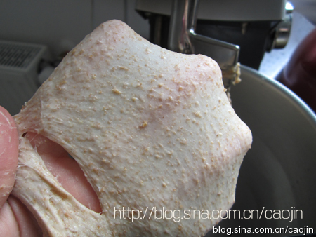 加入黄油后继续搅拌至完全阶段,即能拉出均匀大片的薄膜。检测薄膜有一定的韧性。破洞呈圆形。
