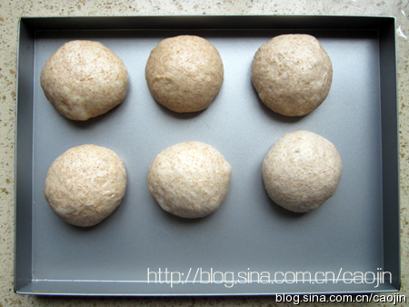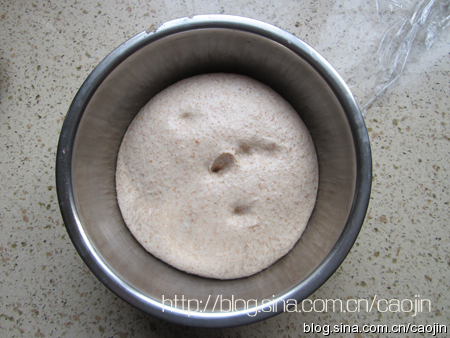 放温暖湿润处,最后发酵约1小时。至10份满。(全麦面团烘焙的膨胀性没有全部高筋粉的好,所以发高一点,因为量也大一点)