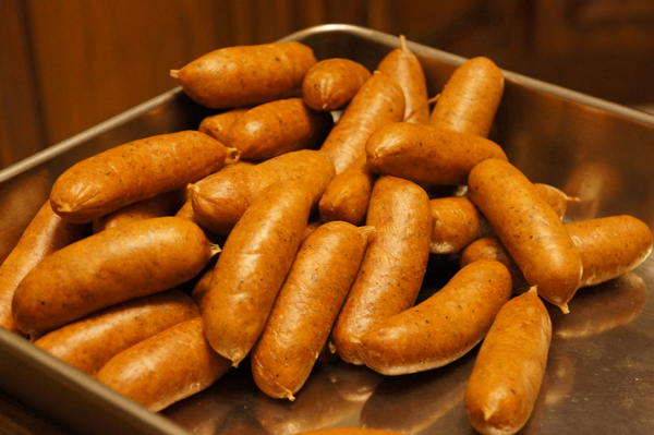 煮香肠一定不能把香肠丢到沸水里,跟煮贡丸一样,大概70度丢进去,慢慢继续加热,到香肠浮起来即可。