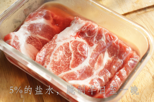 买回的猪排,先用5%的盐水(即5g盐兑100g水,腌多等比例增加),浸泡半日或者过夜皆可。