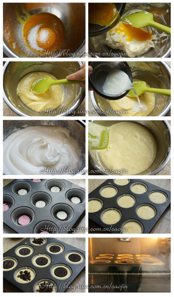 将奥利奥饼干扭一扭分开,马芬模放好纸杯,并将一片饼干放入纸杯做底