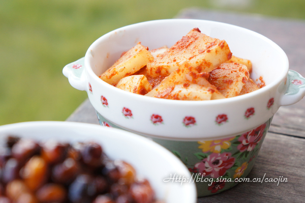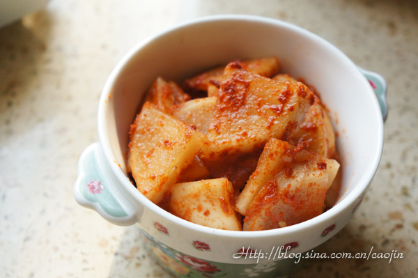萝卜切大块,用糖,盐抹下,腌2小时左右,腌出的汤汁要收集起来留用。