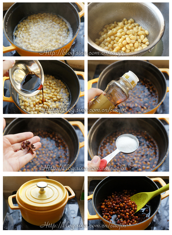 3-6,再加入没过豆子的水,煮沸后加入酱油,老抽,麻油,和糖。