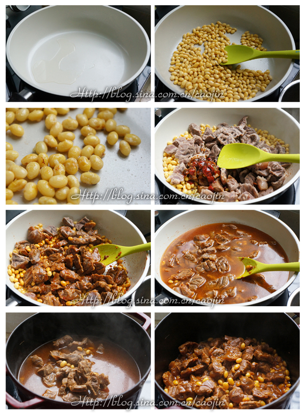 准备工作:牛腱肉先切片,然后汆水撇去血沫。黄豆提前一晚或者半日泡发洗净。