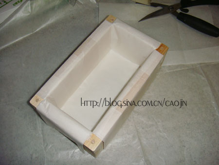 1) 木框內部鋪烤盤紙(可用膠帶黏),放在烤盤上,底下墊3張4摺的報紙。墊報紙是為了避免蛋糕底部烤得過焦。”