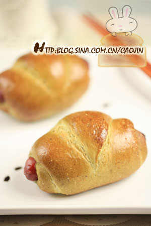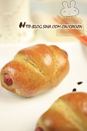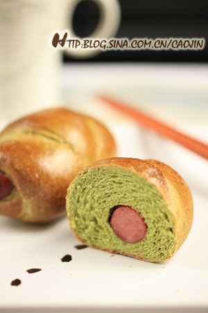 这个切面有点像过期的抹茶…其实是因为我在面团里加了很多海苔粉…这种海苔粉是那种超级细的,可以揉入面团中的..我一眼看上去觉得像抹茶..那么就干脆也就类似抹茶的用了.试用了用量比抹茶略大,海苔也吸水导致面团吸水变多..加了热狗,做成咸口。