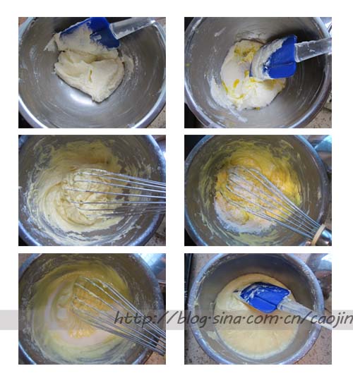 黄油软化+糖,打发至发白。