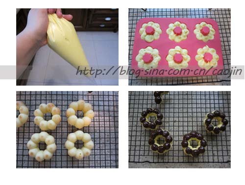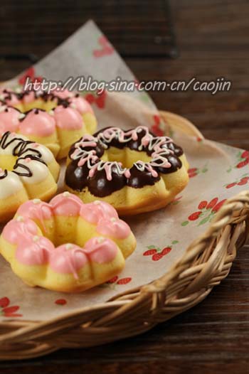 鸡蛋打散,分次加入。泡打和低筋粉混合过筛后,跟牛奶分次,依次加入。(即加点牛奶啊加点粉,加点牛奶啊加点粉)混合均匀后装入裱花袋。挤入模具。180度烤约15分钟。