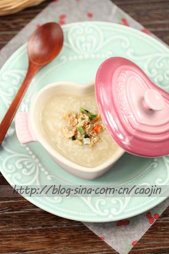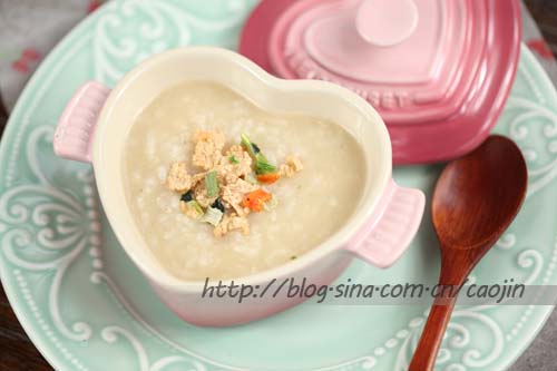 等粥煮至浓稠烂滚了,下腌过的鸡肉。滚熟。在稍微炖下,最后点盐,胡椒粉,麻油等调味~