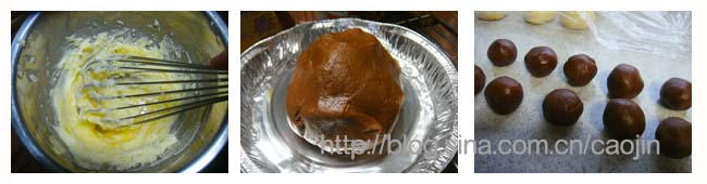 3,可可粉和低粉混合均匀过筛后,加入黄油中揉捏均匀