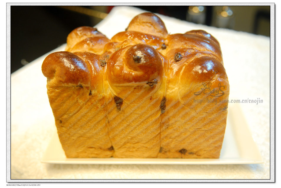 –吐司的味道有淡淡焦糖味,夹杂巧克力豆甜中有苦,还算不错,其实无论加了多少配料,吐司都是满淡味的,这也是吐司的魅力所在吧,搭配其他从不会喧宾夺主,低调的,隐约的。