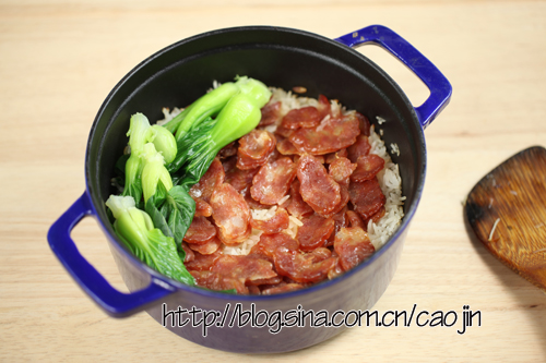 这时候把切片的腊肠扔进去,铺满。继续加盖,转小火焖约10-12分钟。
