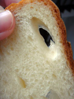 擀第一个吐司的时候,下手轻了,能看到气泡…所以毫无意外地,偶的包出现了灵光滴大洞洞~再卷第二个的时候就没有了…可见欧包做多了…一时还调整不过来哈~多么难得的洞啊…偶的拿出来炫耀下~~hiahia