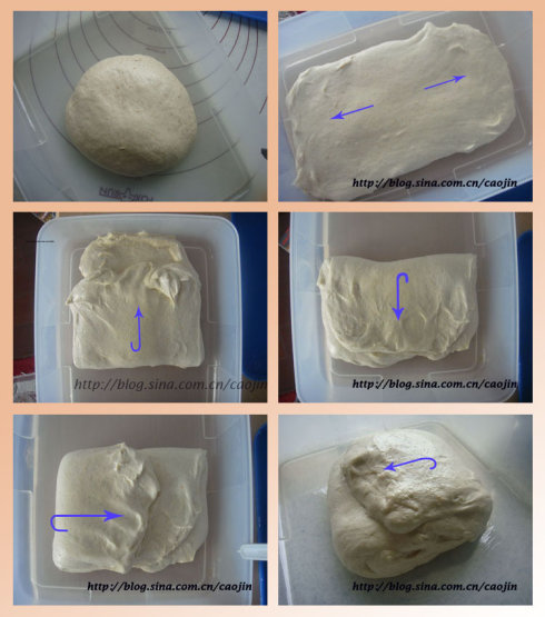 之后将面团放入抹油的容器中室温发酵4个小时,(容器最好大一点,方便之后做折叠面团)在30;60;90分钟的时候做折叠(如下图)一次发酵完成的时候,面团也没有达到2倍大,不过没有关系。