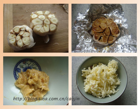 1颗中型蒜,去掉上面部分撒橄榄油,包锡纸,烤箱预热180度,烤1小时左右冷却用叉子压成泥,加入适量的橄榄油(大概1-1.5t)及黑胡椒粉调味,冷却待用。