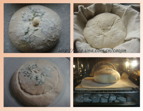 提前45分钟预热烤箱石板和产生蒸汽的石子…到250度,发酵到7-8分的时候,将面团扣出,割包…(又可以割包,开心)之后将面团和油纸一起转移到石板上,往下层石子上浇半杯开水,关烤箱门。将温度降为220度
