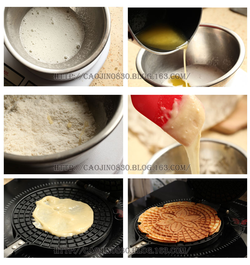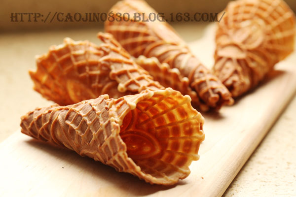 加热蛋筒模,挖一勺面糊,合拢翻面几次,到金黄色,戴手套趁热卷起即可。这个蛋筒,没有外面的那股子香精味,是很怀旧的味道,即使沾到融化的冰淇淋浆也不会变软呢