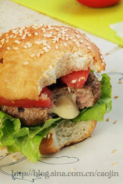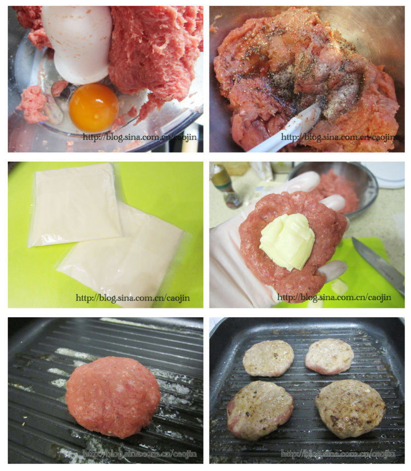 汉堡排大约60g每个,拍扁,包入5g左右片状芝士(事先切碎捏扁)用煎锅煎至熟即可。一般看到有点点的芝士冒出就差不多熟了。