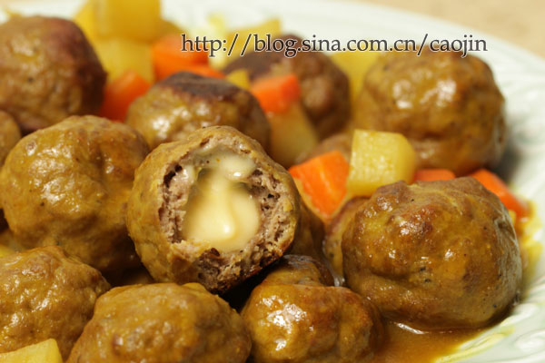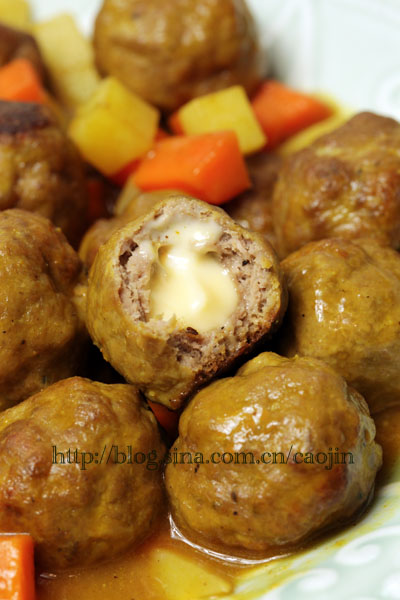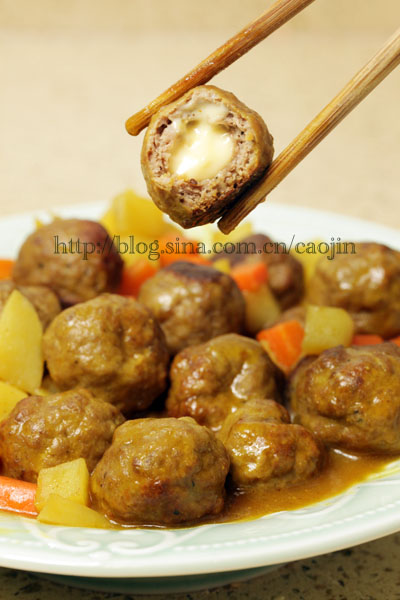 用现成的咖喱块,先将土豆和胡萝卜丁略炒。然后下水或者清鸡汤,放咖喱块。丸子,一起咕嘟咕嘟煮。