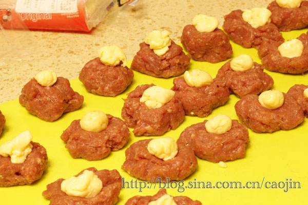 如果做肉丸,我是19-20g每个,分割好,再分割2g每个的芝士馅。 最后包入芝士的肉丸,滚圆,收好口。不要露出芝士哟。烤之前表面刷点油,丸子更脆哟