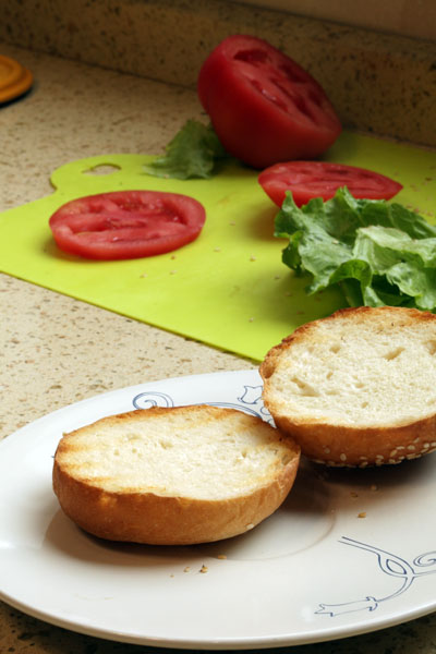 还可以做早饭,早起,把汉堡排和切开的面包都放在煎锅上烤下(面包烤下也会热乎乎的而且底部脆脆的很好吃捏)