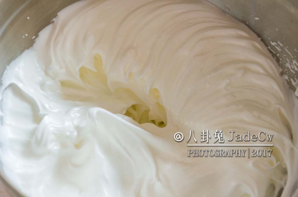 3,之后间隔的加入剩余砂糖+水饴。一直打发至硬性发泡状态。