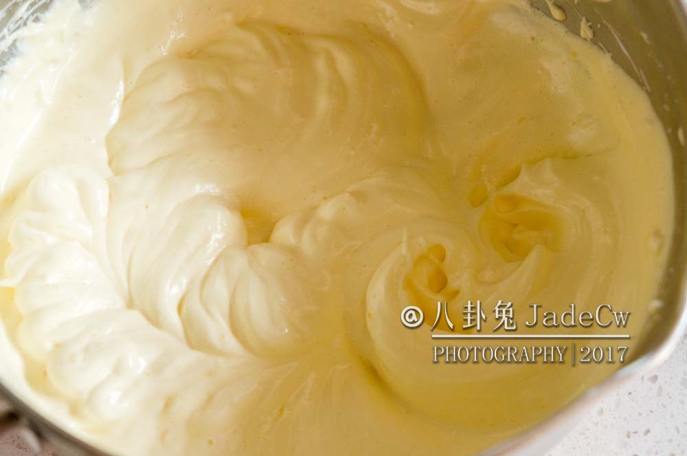 4,依次加入蛋黄,继续高速搅拌,至全蛋糊光泽,花纹清晰可见。