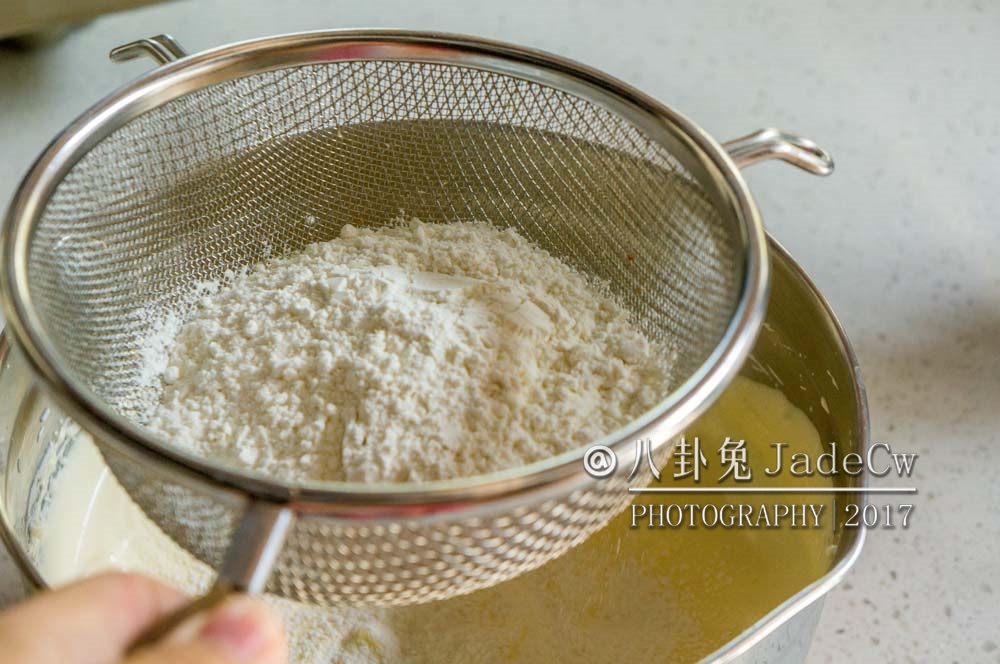 6,筛入全部的粉类!注意粉类必须过筛加入,直接加入会结块!