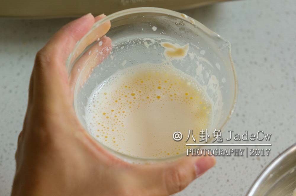 9,然后从大约10cm高度倒入模具。大概都是9.5分满吧!如果你差太多,那肯定是消泡了~~~~~~~~~