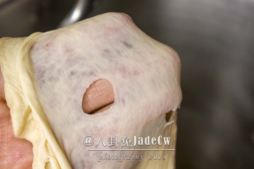 1,后油法:除软化黄油外所有材料倒入厨师机的搅面缸(注意酵母与盐不直接接触),揉至面筋扩展后再加入黄油。揉至能拉开薄膜的扩展阶段即可。