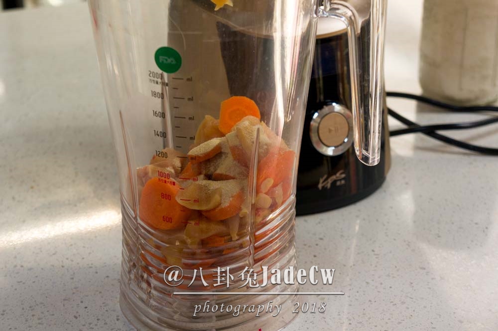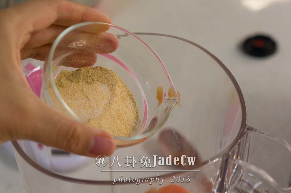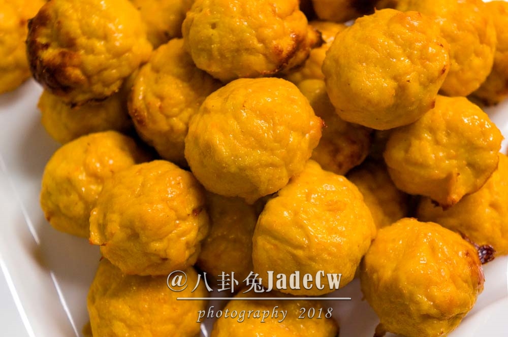 胡萝卜鸡肉丸(大约40颗) 鸡胸肉:500g 胡萝卜:150g 盐:5g 糖:10g 大蒜粉:6g 白胡椒粉:1g