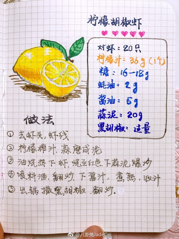 发布于2017年8月14日2019年6月11日 由八卦兔JADECW柠檬胡椒虾 一颗柠檬,一盘虾。酸甜鲜香狠下饭~~ 超级快手又好做,15分钟端上桌。 视频里如果看不清配料可以看这个哈。这个话题专门发快手好吃家常菜什么的哈。 收藏 (5) +1已打分已有 5 用户参与55 : 0 +1已打分